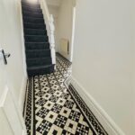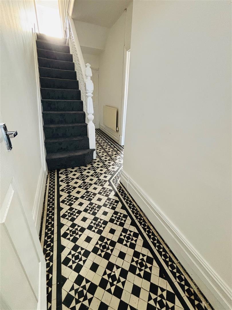 Plaster painted walls and ceiling, central light. Feature arch. Radiator. Wooden banister, carpet to stairs. Decorative floor tiles. Under stair storage cupboard.