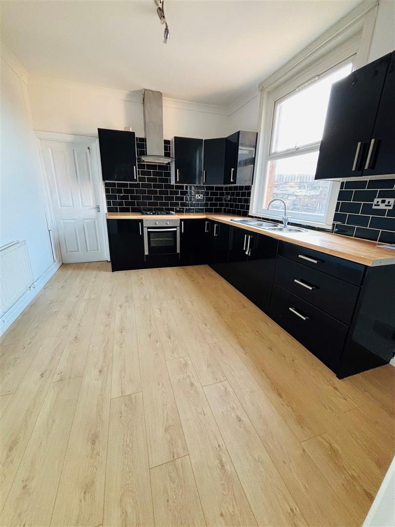Upvc double glazed window to side. Plaster painted walls and ceiling, central light. Range of wall and base units, laminate work surface, tiled in between units. Gas hob, electric oven and electric extractor hood. Space for fridgefreezer. Stainless steel round sink bowl with drainer and mixer taps. Chrome sockets. Space for kitchen table. Under stair storage cupboard. Laminate flooring.