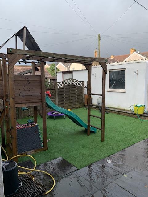 Fully enclosed rear garden comprising of slate paved patio, area laid to artificial turf, children's play unit comprising of treehouse, swings and climbing frame, outdoor lighting, outbuilding with PVCu door and window, rear gate giving rear lane access.