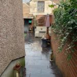 Courtyard area with low wall and railings to the front with access via wrought iron gate,, side gate access to rear garden.