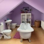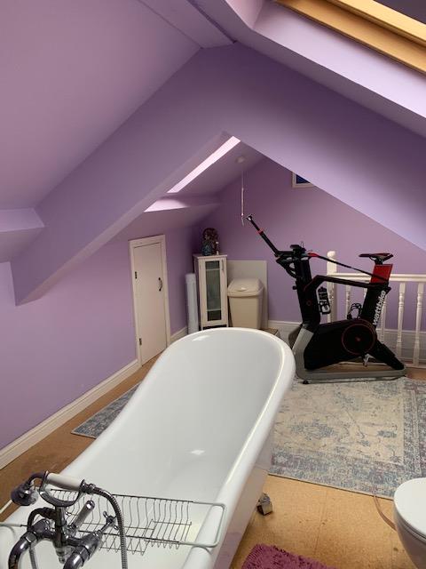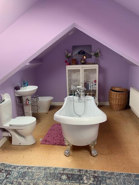 Four piece bathroom suite comprising of roll top bath with mixer tap, low level W.C., pedestal wash hand basin with mixer tap, bidet, chrome towel radiator and standard double radiator,, cork tile flooring, emulsion walls, storage cupboards to the eaves, Velux windows to the front and rear.