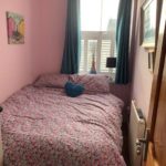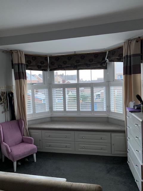 Large front facing bay window with bespoke window seating with built in storage cupboards below with matching double and triple wardrobes, original cast iron fireplace with quartz base, carpet to the floor, emulsion walls, with coving to ceiling, central light, Venetian shutter blinds and roman blinds to remain