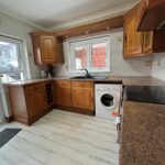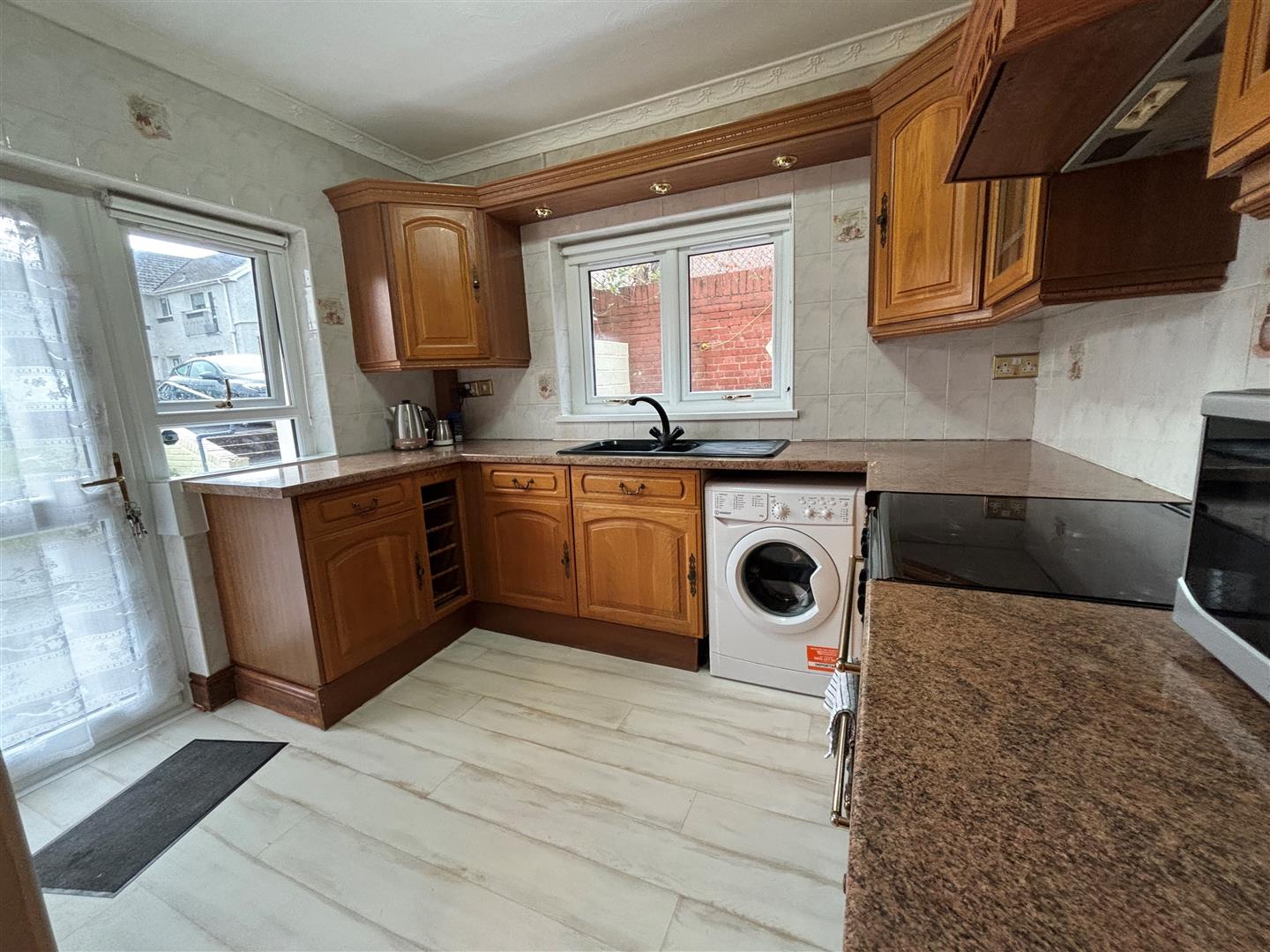 Two Upvc double glazed windows and Upvc double glazed rear door leading to rear communal garden area. Range of wall and base units, laminate work surface, black one and a half sink with drainer and mixer taps, freestanding gas oven and hob, extractor fan, plumbing for washing machine, space for fridge freezer. Fully tiled walls, vinyl flooring, radiator. Central light and spot lights above sink. Large walk in storage cupboard housing combination boiler serving domestic hot water and central heating.