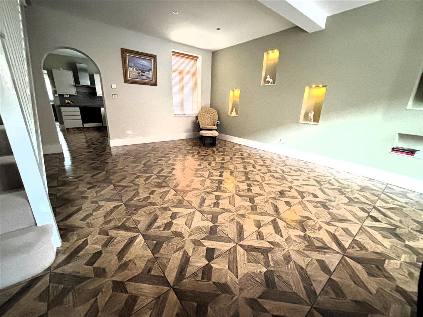 Upvc double glazed bay window to front. Plaster painted walls and ceiling, spot lighting, ceramic floor tiles, underfloor heating. Decorative alcoves with spot lighting. Upvc double glazed window to rear. Arch through to kitchen. Stairs leading to first floor.