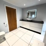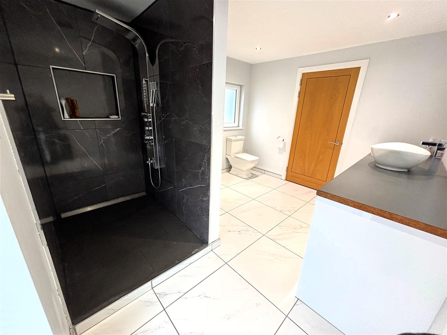Triple glazed Upvc window to side and rear, wooden venetian blinds. Plaster painted walls and ceiling, spot lighting. Low level w.c, ceramic bowl wash hand basin, range of storage cabinets. Fully tiled shower enclosure with jet powered and rainwater shower. Ladder radiator, ceramic flooring, underfloor heating.
