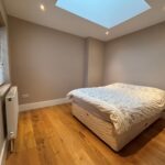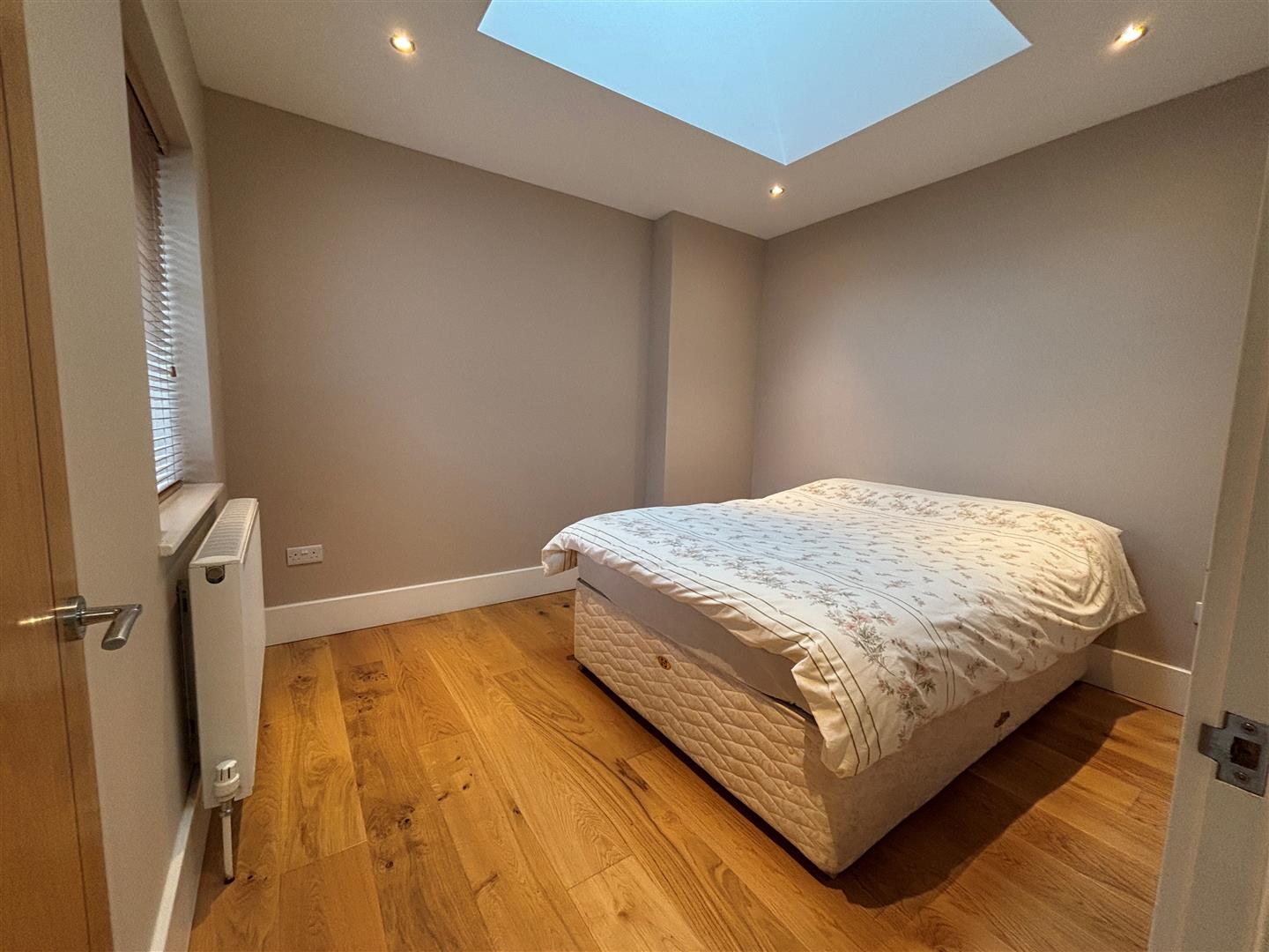 Upvc double glazed window to rear, wooden venetian blinds, skylight window. Plaster painted walls and ceiling, spot lighting, laminate flooring, radiator. Alcove storage area.
