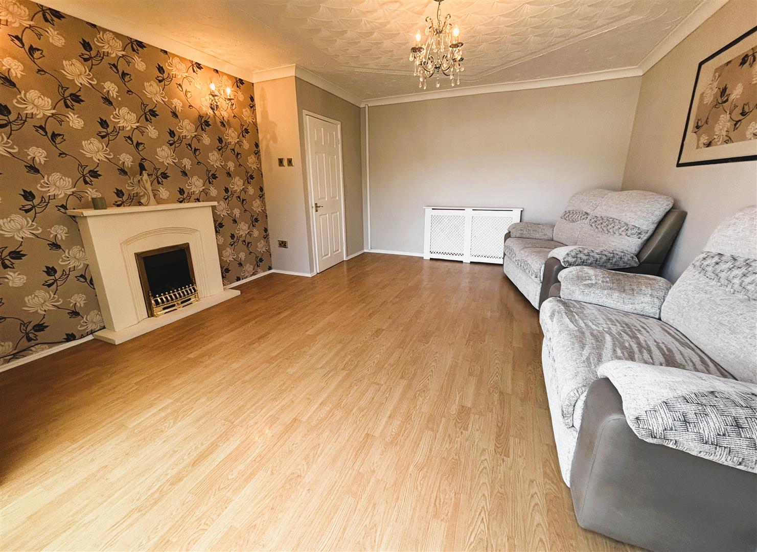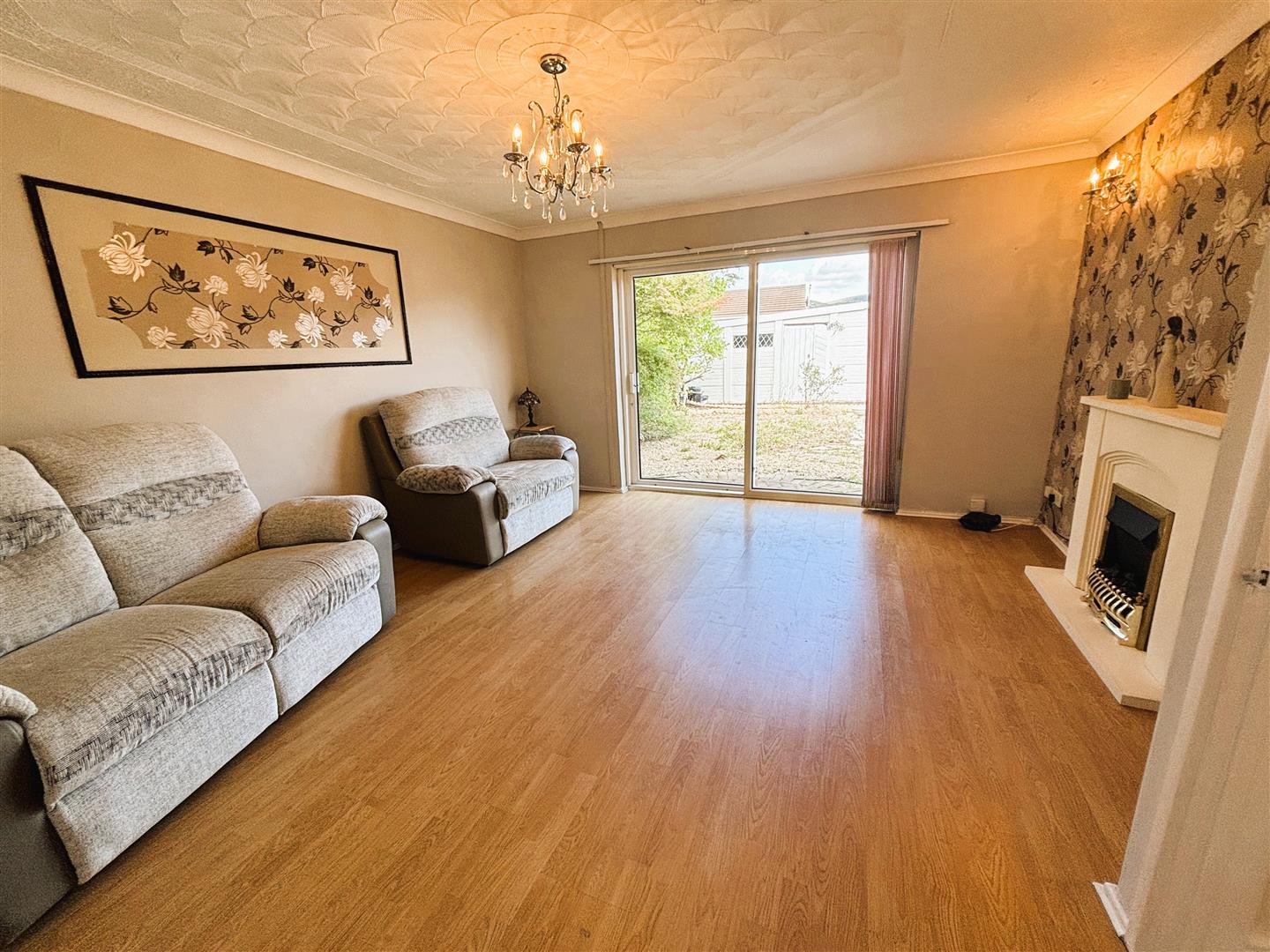 Upvc patio doors onto front garden. Plaster painted walls with feature wallpapered walls, artex ceiling, central light. radiator, laminate flooring. Feature fireplace housing electric fire.