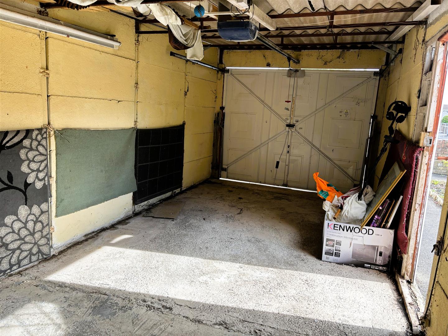 Electric up and over garage door, personnel door leading from garden.