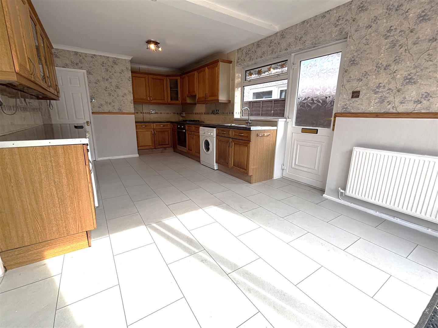 Entrance through Upvc double glazed door into kitchendiner. Plaster painted walls with paper above the dado rail, plaster painted ceiling, two central light fittings. Range of wall and base units, laminate work surface. Integrated electric oven, gas hob, space and plumbing for washing machine, space for under counter fridge and freezer. Stainless steel sink with mixer taps. Radiator, laminate flooring. Space for dining table.
