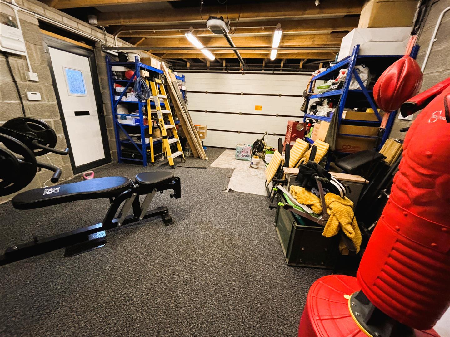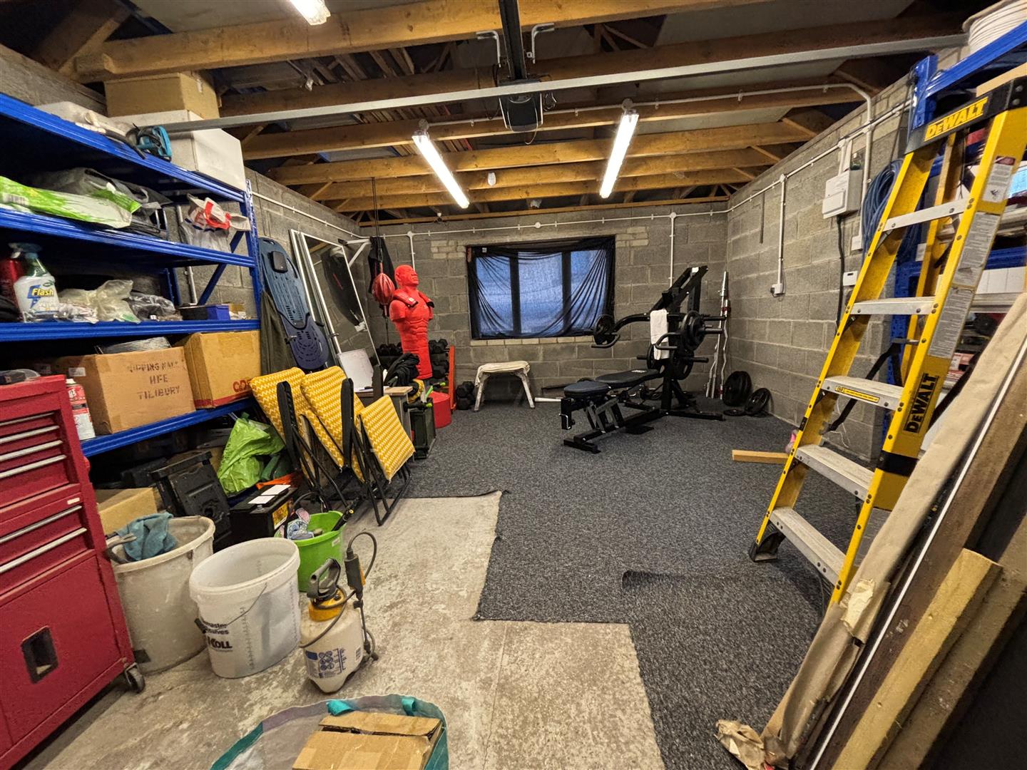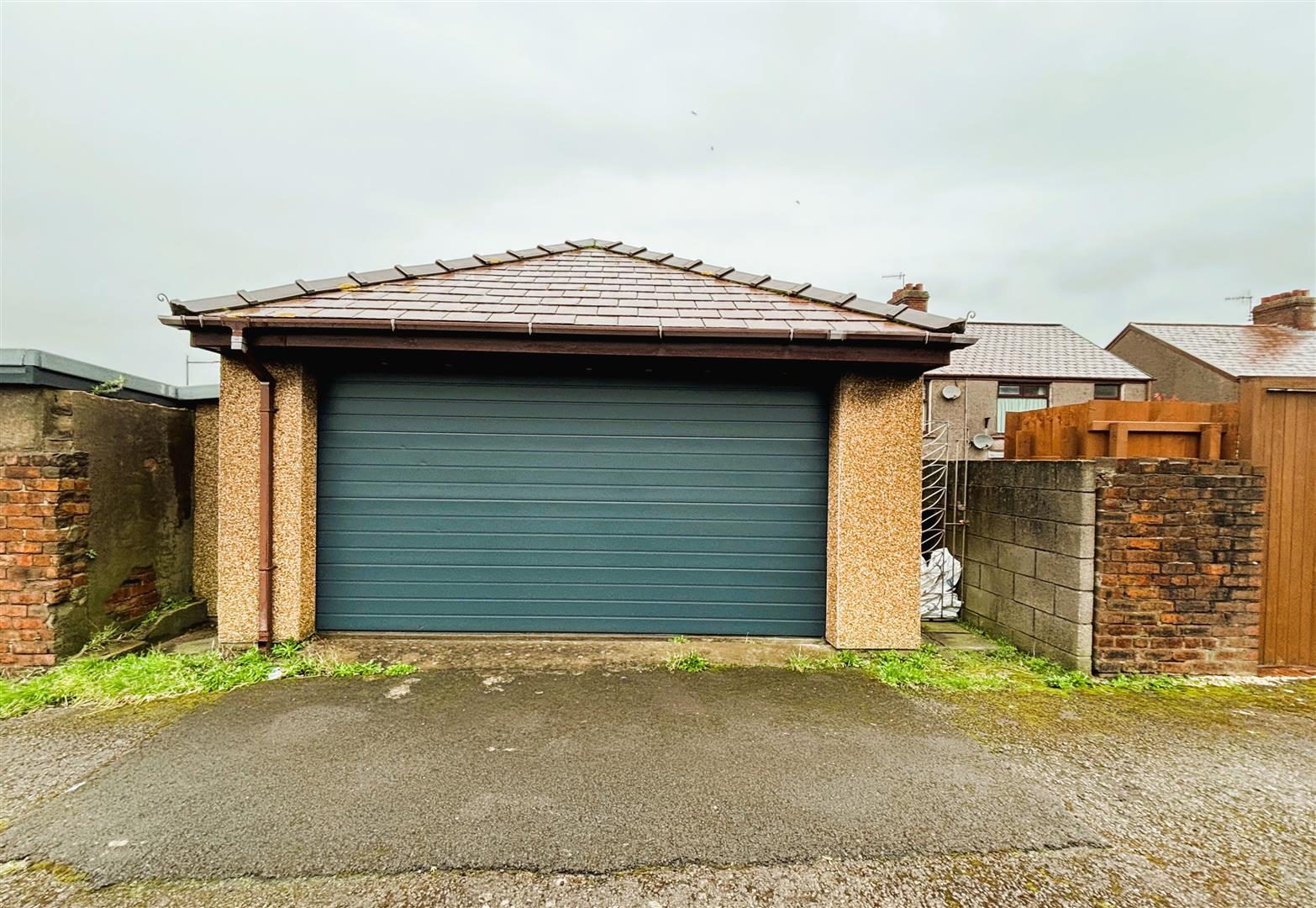 Side personnel door into double garage. Up and over electric garage door. Brick built and rendered, tiled roof. Upvc double glazed window to rear. Electricity supply and several sockets. Storage area to the eaves of the roof, part boarded.