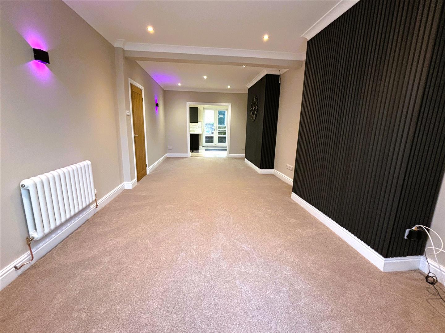 Upvc double glazed bay window to front, vertical blinds. Emulsion painted walls and ceiling, spotlights, wall lights, with feature wood panels, carpet.
