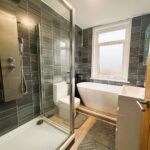 Upvc double glazed window to rear. Fully panelled walls. Freestanding oval bath, vanity wash handbasin, low level w.c,. Shower enclosure, glass doors, rainwater double shower, chrome ladder radiator, LVT plank flooring.