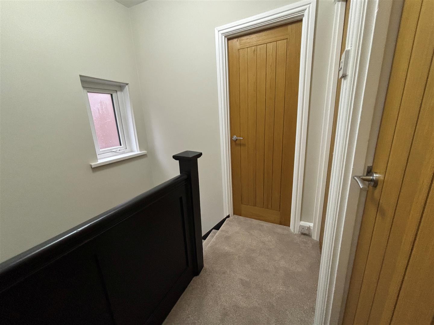 Upvc window to side. Emulsion painted walls and ceiling, painted wooden banister, carpet to stairs and landing. Access to loft part boarded.