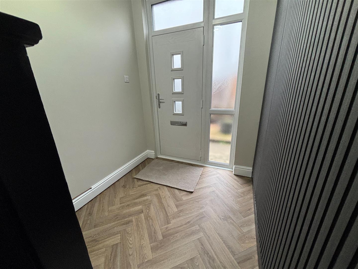 Entrance through composite front door into hallway. Emulsion painted walls and ceiling central light with feature wood panels to one wall. Radiator, vinyl flooring. Under stair storage.