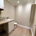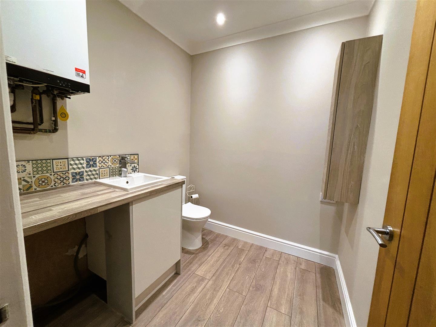 Emulsion painted walls and ceiling, spot lights. Sink with mixer taps, low level w.c, chrome ladder radiator, LVT plank flooring. Wall cupboard, wall mounted combination boiler.