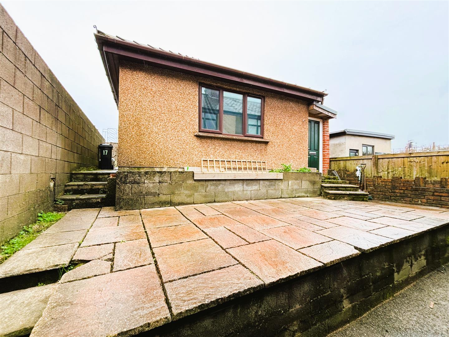 Steps and pathway leading to brick built storage shed by the side of garage.