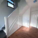 Entry via upvc door, large hallway, laminate flooring, skirting, emulsion walls, central light fitting, radiator, smoke alarm, upvc frosted window to front, power points, storage cupboard housing gas and electric meters, stairs to first floor.