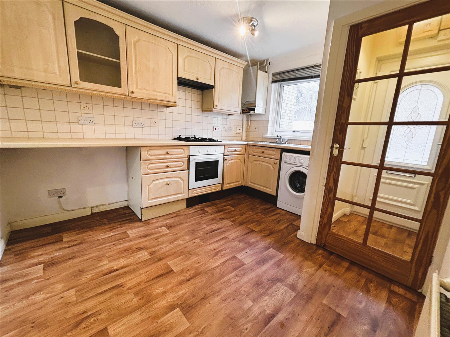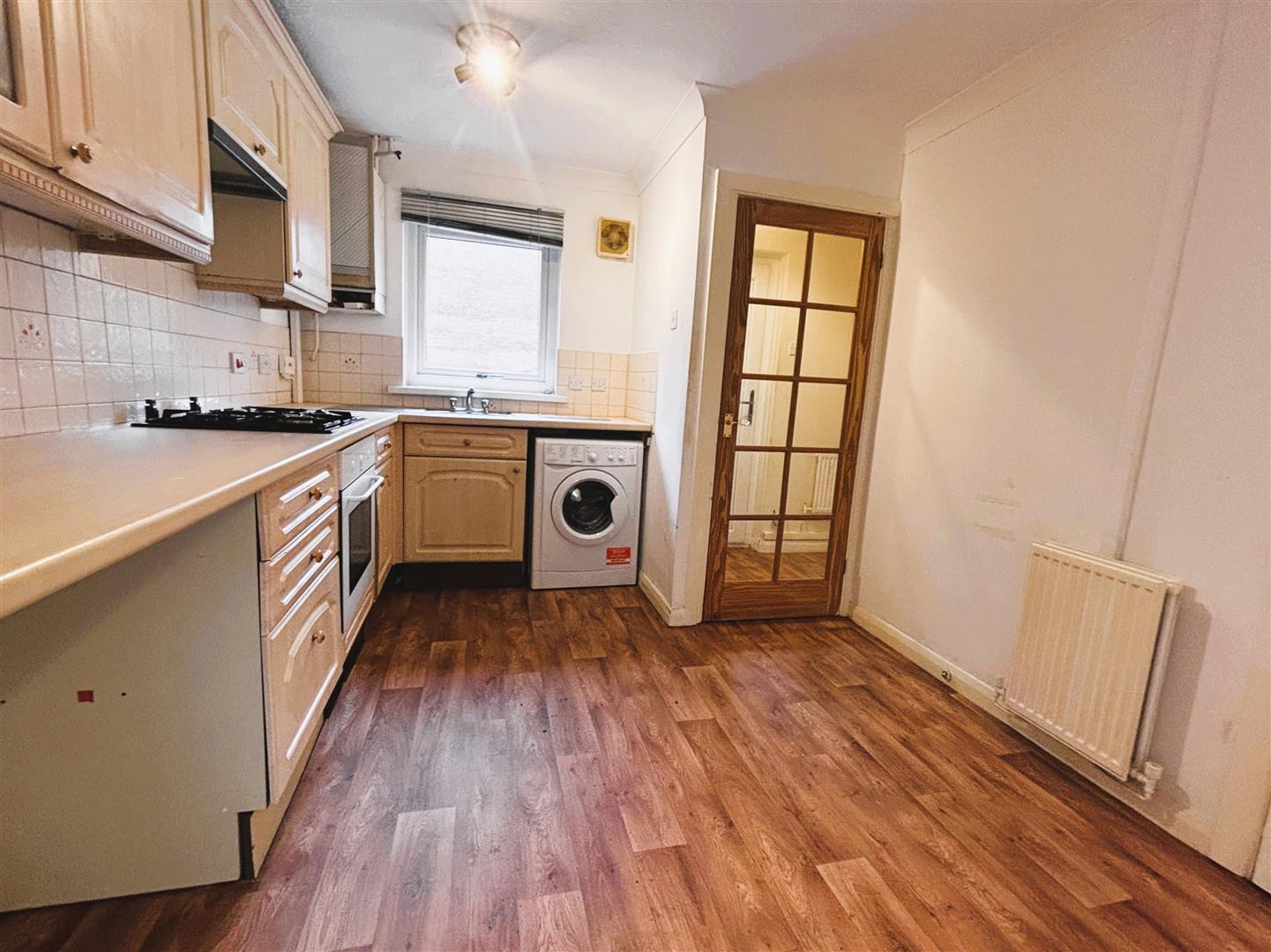 Upvc double glazed window to front. Range of wall and base units, laminate worksurface. Space and plumbing for washing machine, under counter space for fridge and freezer, integrated electric oven, gas hob, extractor fan, stainless steel sink and mixer taps. Tiled in between units with emulsion painted walls and ceiling, central light, radiator, laminate flooring. Wall mounted boiler. Glass pane door into hallway. Under stair storage cupboard.