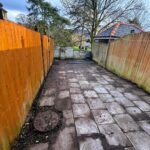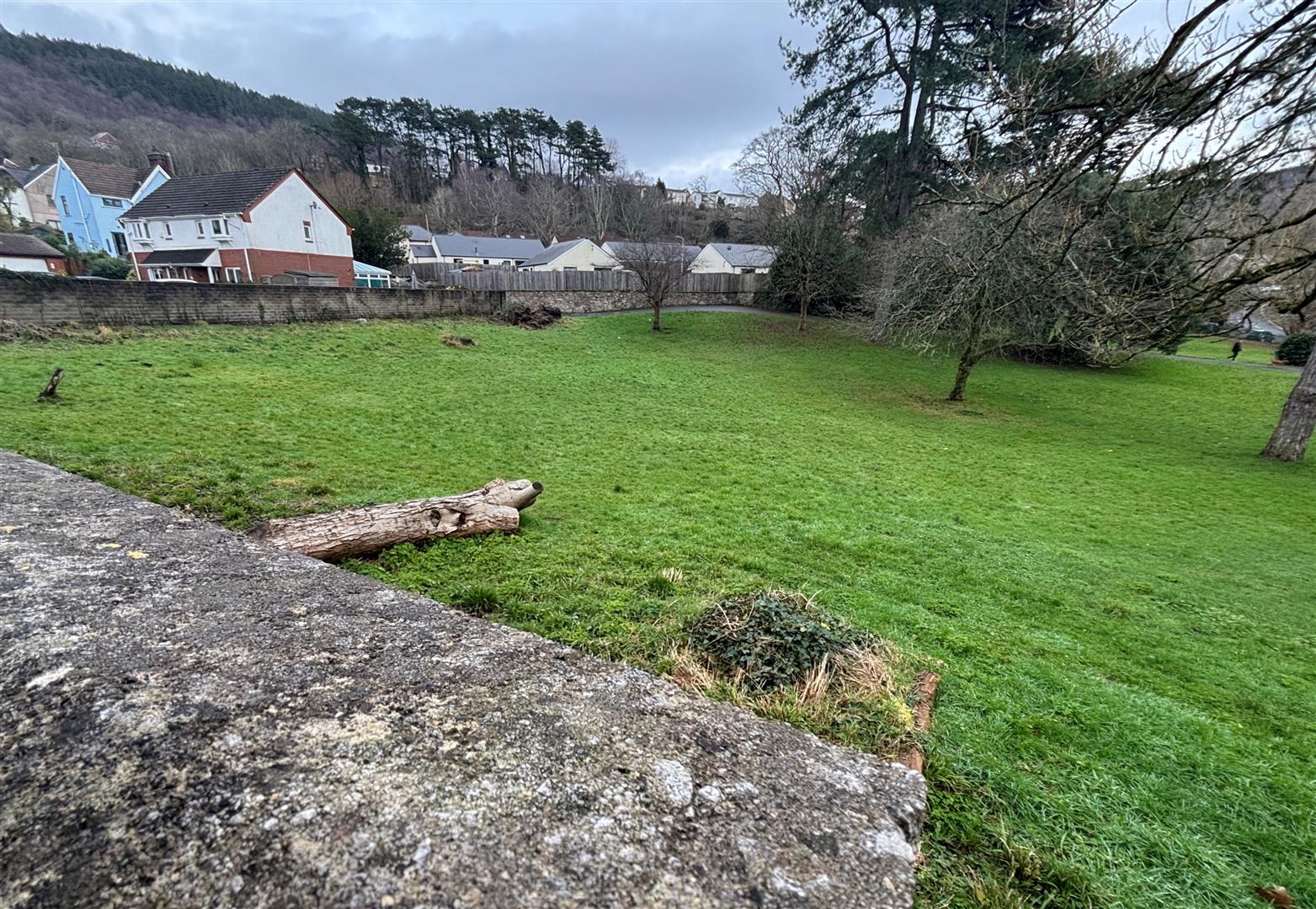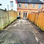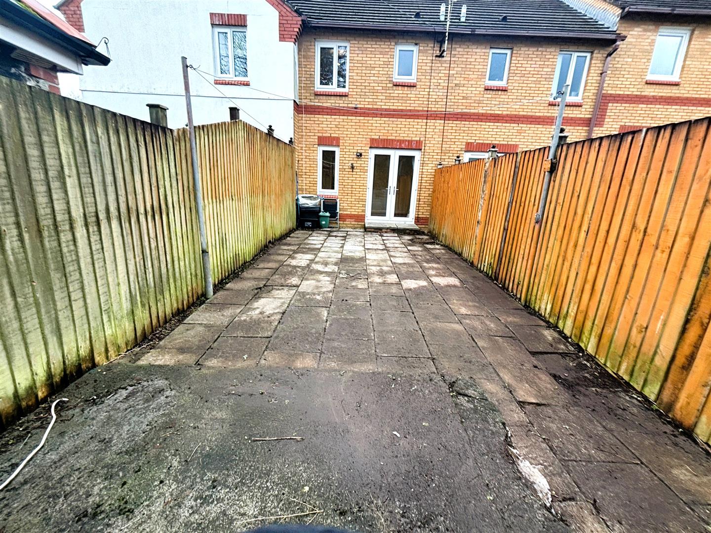 Enclosed rear garden with fence, wall to rear overlooking park. slabbed patio area.