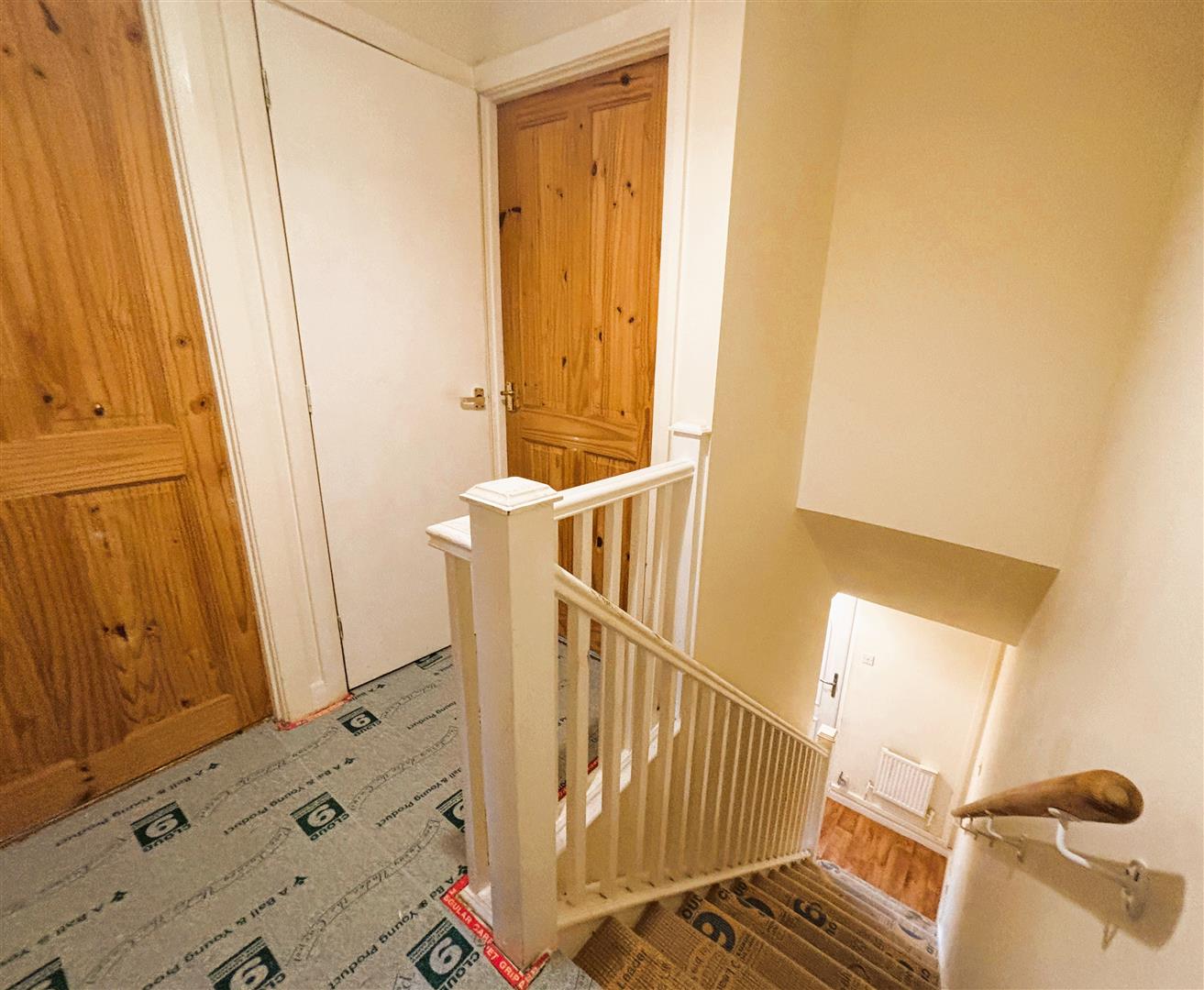 Stairs leading to first floor landing. Wooden banister and handrail. Plaster painted walls and ceiling, central light. Radiator. Access to attic through loft hatch. Cupboard housing water storage tank.