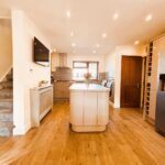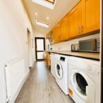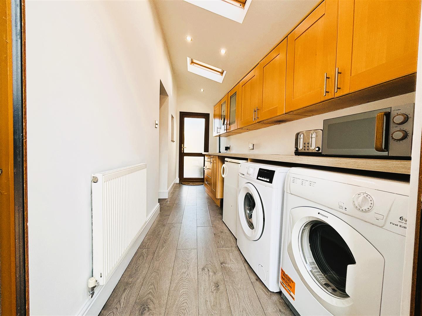 Upvc double glazed door from front access. Emulsion painted walls and ceiling, spot lighting, two velux windows. Wall and base units, space for washing machine, tumble dryer, under counter fridge and freezer, radiator, laminate flooring. Upvc double glazed door to rear.