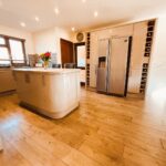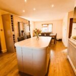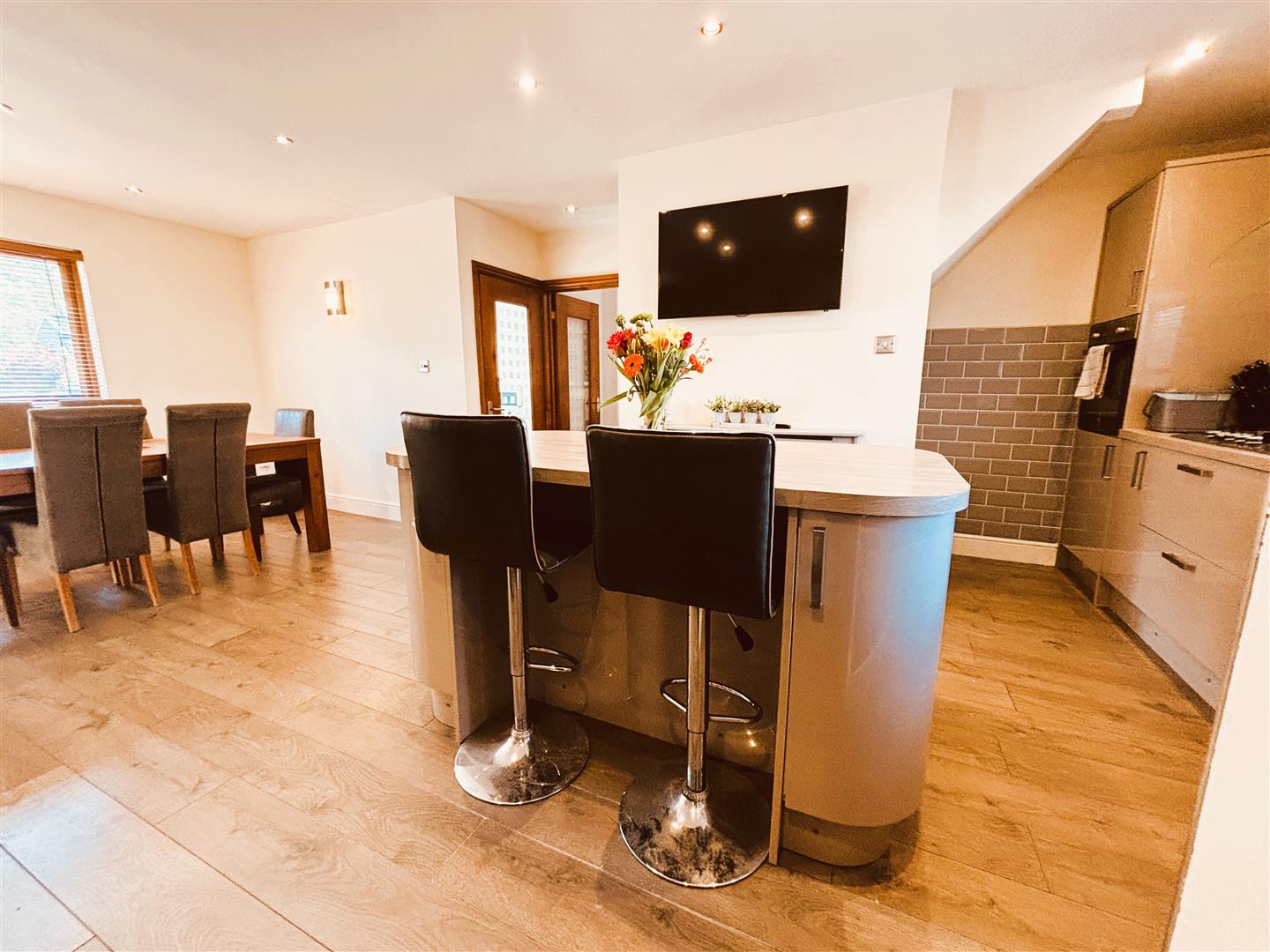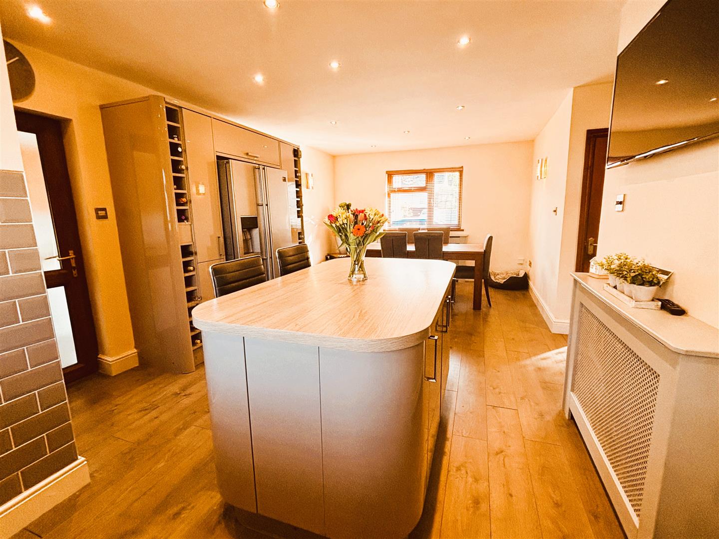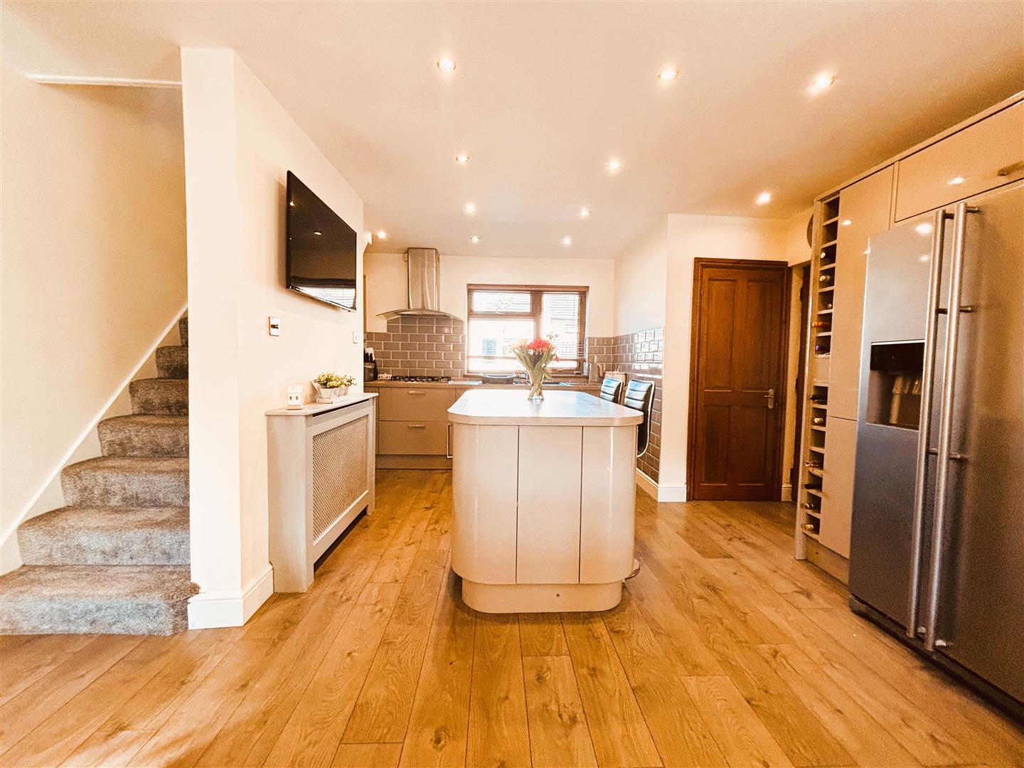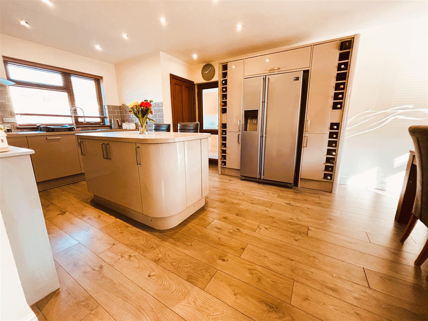 Upvc double glazed window to front and rear, venetian blinds. Emulsion painted walls and ceiling, spot lighting, wall lights. Range of wall and base units, laminate worksurface, integrated eye level electric oven, 5 burner gas hob, extractor fan, integrated dishwasher, composite one and a half bowl sink with flexible mixer tap. American fridgefreezer housed in fitted kitchen cupboards with pull out pantry unit and wine rack surround. Central island, laminate worksurface, with storage cupboards and bar stools. Space for large dining table and chairs, under stair storage cupboard. Two radiators, laminate flooring. Stairs to first floor.