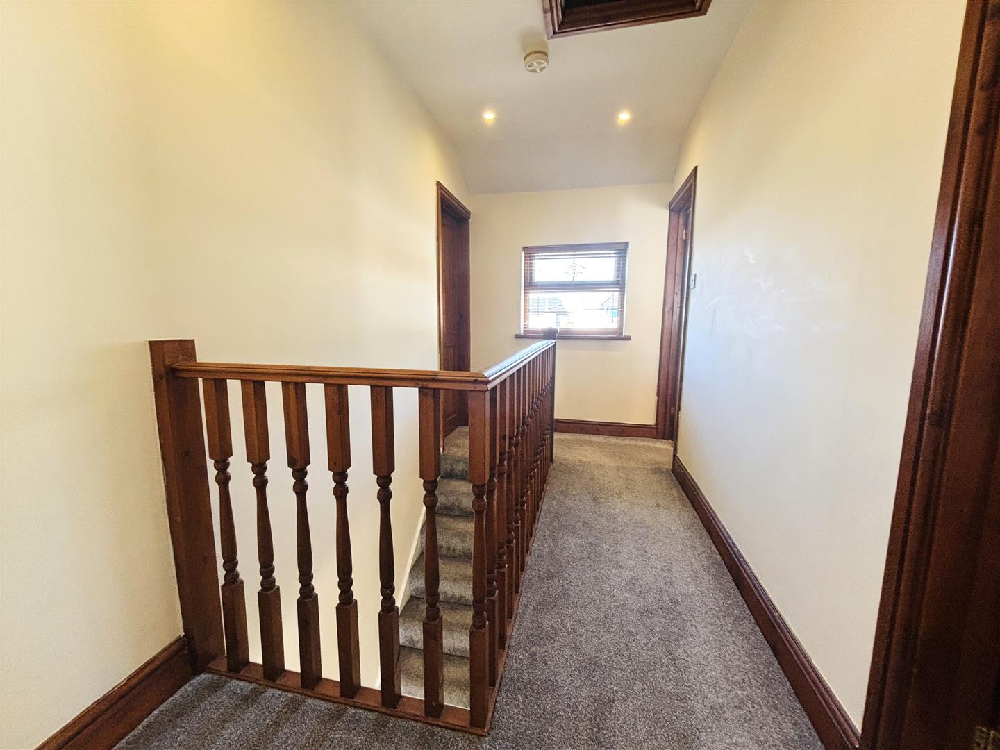 Carpet to stairs leading to landing, wooden banister, emulsion painted walls and ceiling, spot lighting, smoke alarm, access to loft.