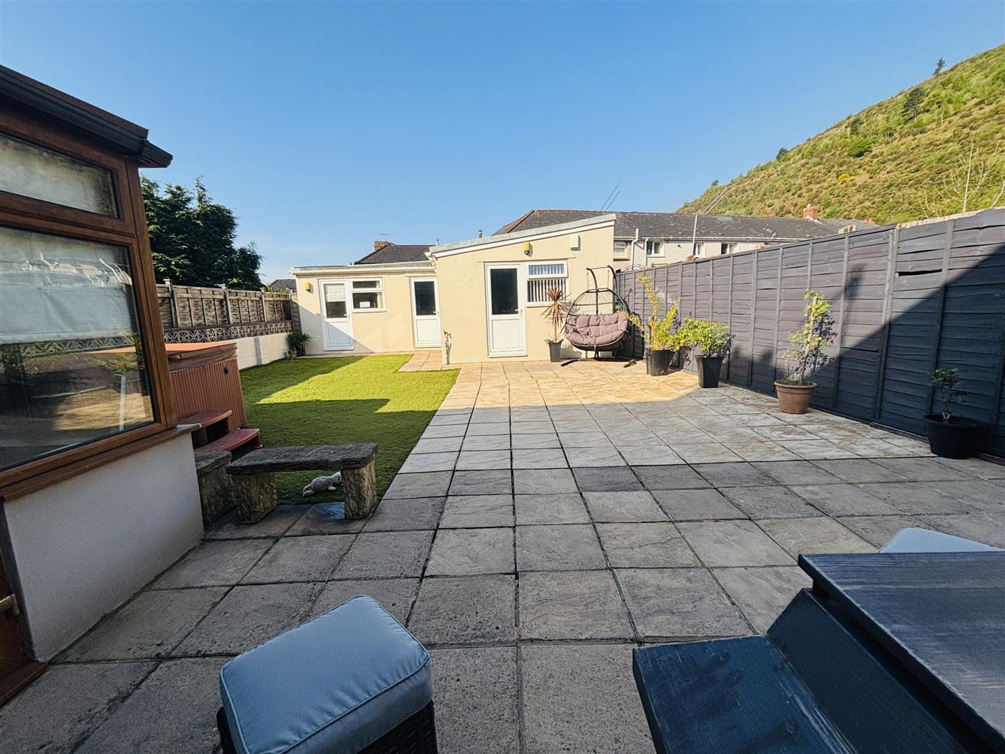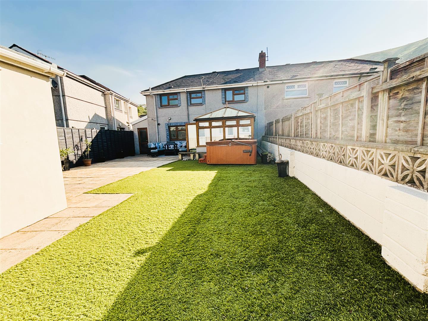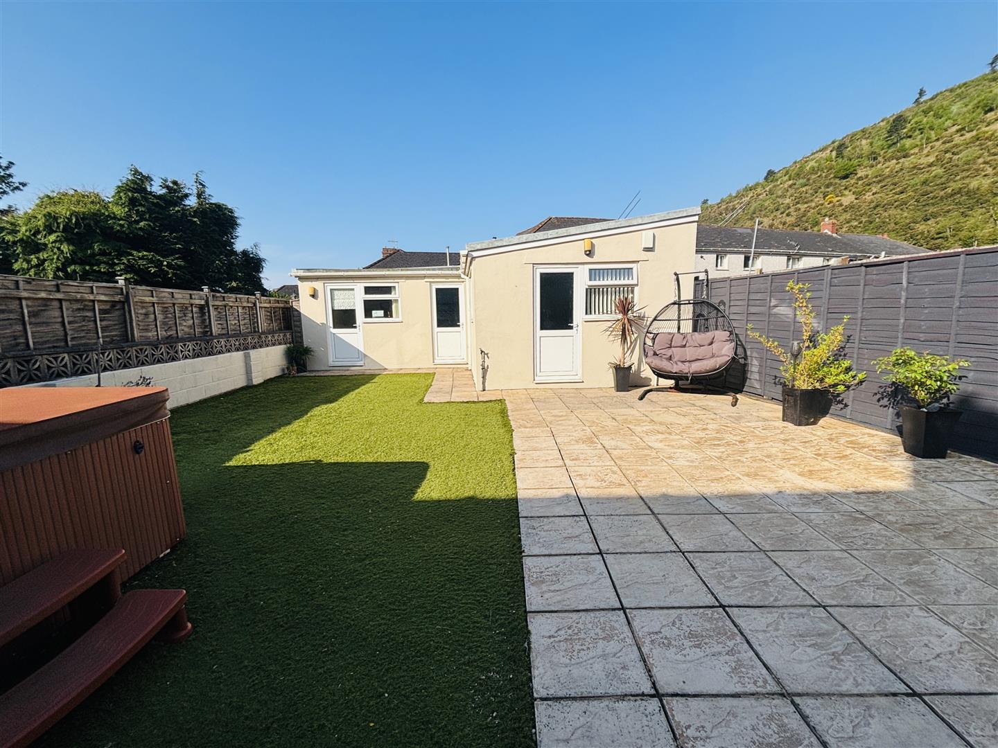 Fully enclosed large rear garden with patio seating area, astro turf, hot tub seating six people, outdoor lighting, electric socket and outside tap.