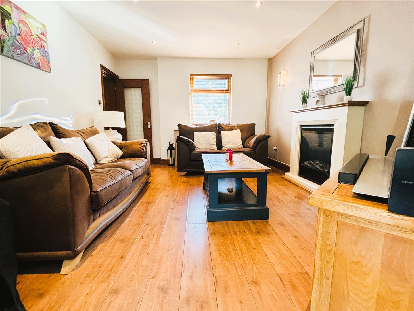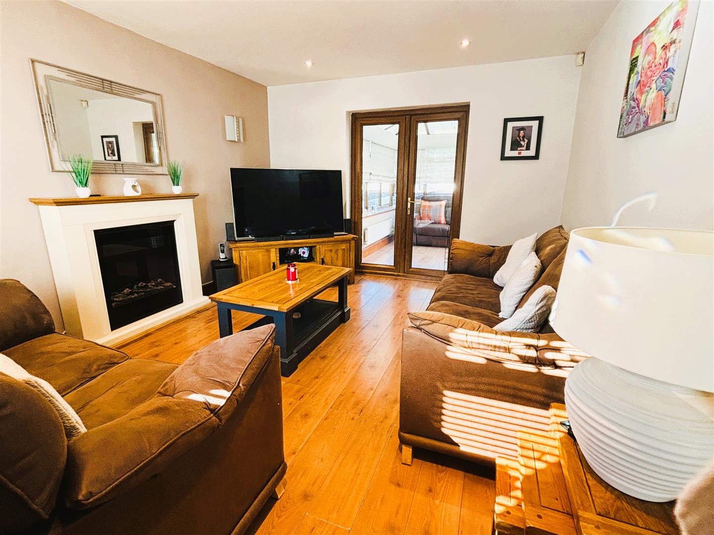Upvc double glazed window to front, venetian blinds. Emulsion painted walls and ceiling, spot lighting, radiator, laminate flooring. Feature fire place housing electric fire. Upvc french doors opening into conservatory.