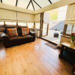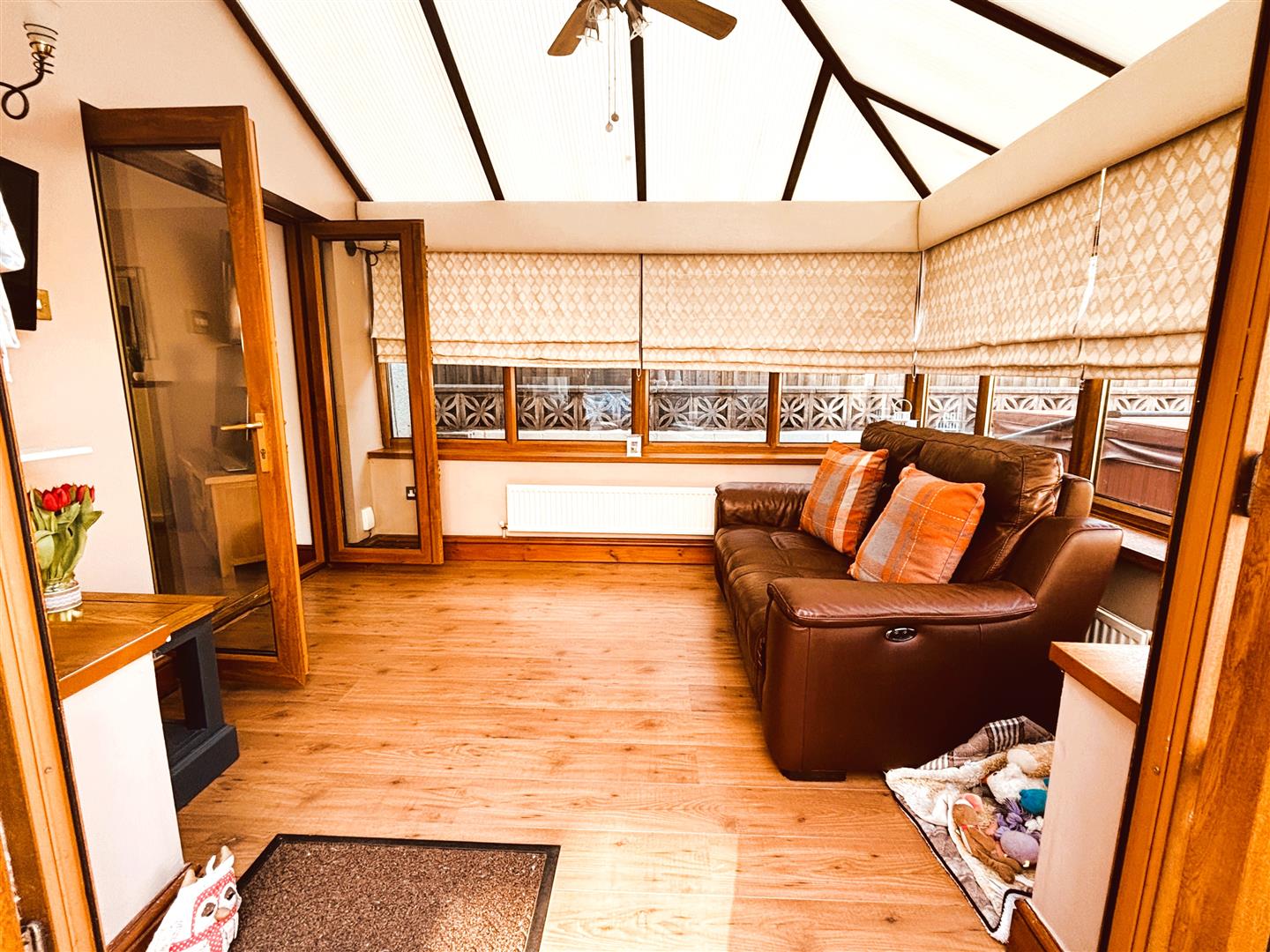 Upvc double glazed with half walls around, upvc double glazed french doors to garden. Roman blinds. Central fan light, wall lights, two radiators, laminate flooring.