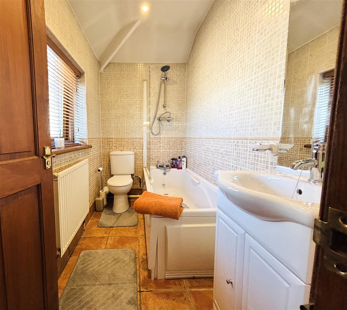 Upvc double glazed opaque window to rear. Fully tiled walls, emulsion painted ceiling, spot lighting. Standard bath with mixer shower head and shower over bath. Low level w.c, wash hand basin, radiator, ceramic floor tiles.