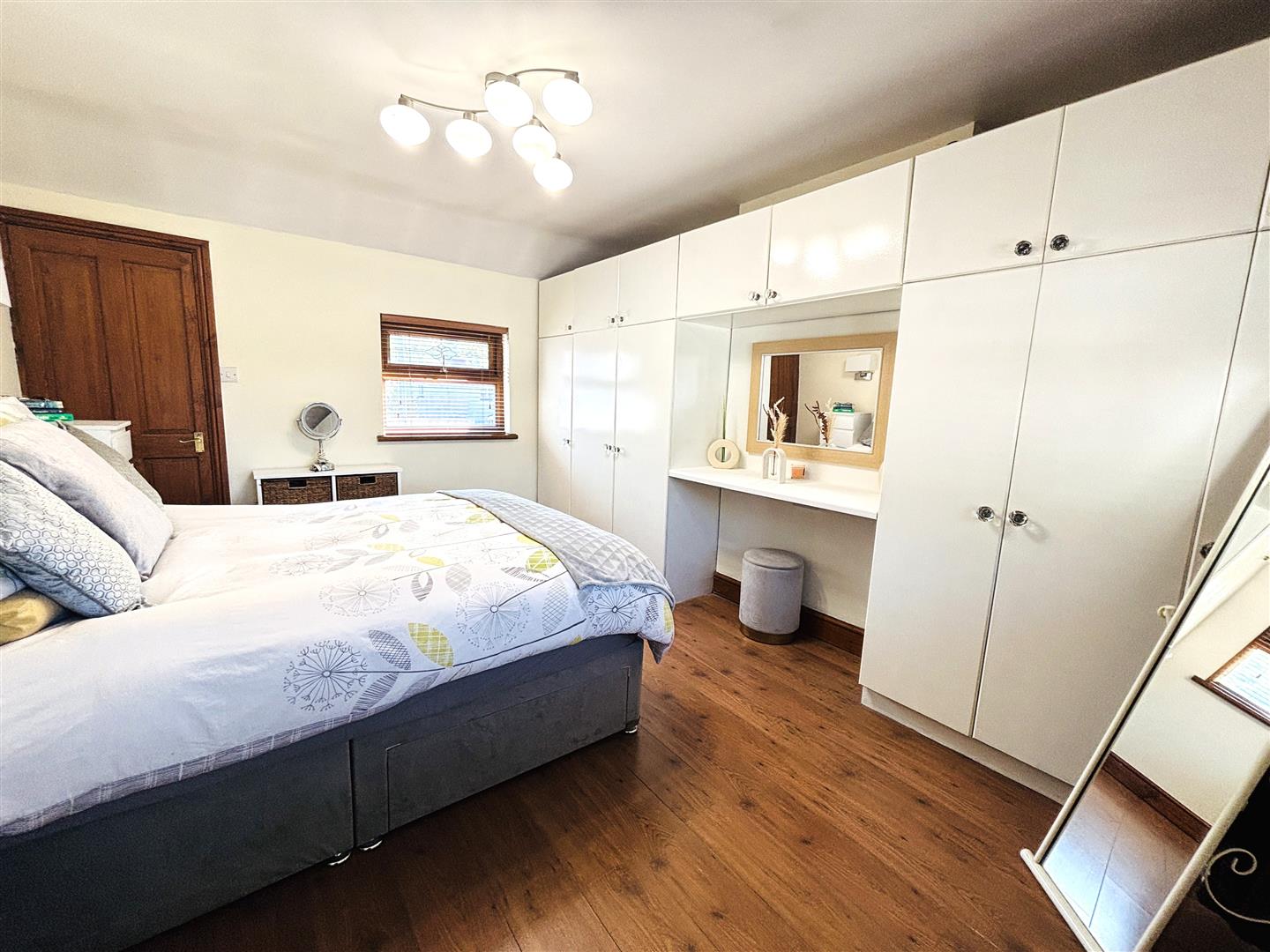 Upvc double glazed window and door, vertical and roller blinds Emulsion painted walls and ceiling, spot lighting, electric sockets, laminate flooring.