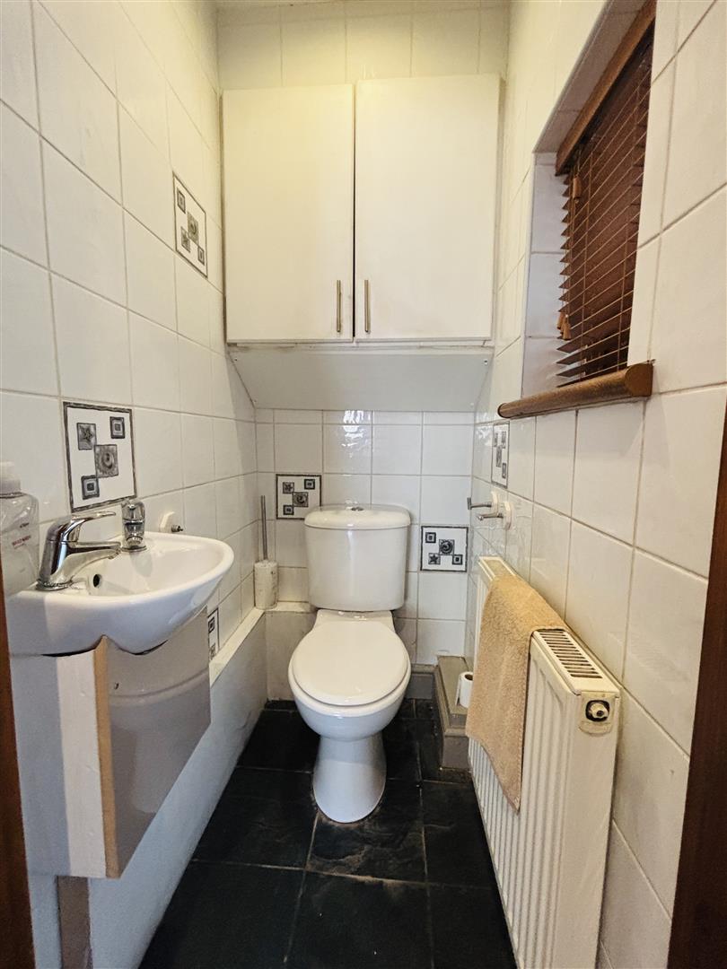 Upvc double glazed window to side, venetian blind. Fully tiled walls, plaster painted ceiling, spot lighting, low level w.c, wash hand basin, radiator, ceramic floor tiles. Cupboard housing combination boiler.